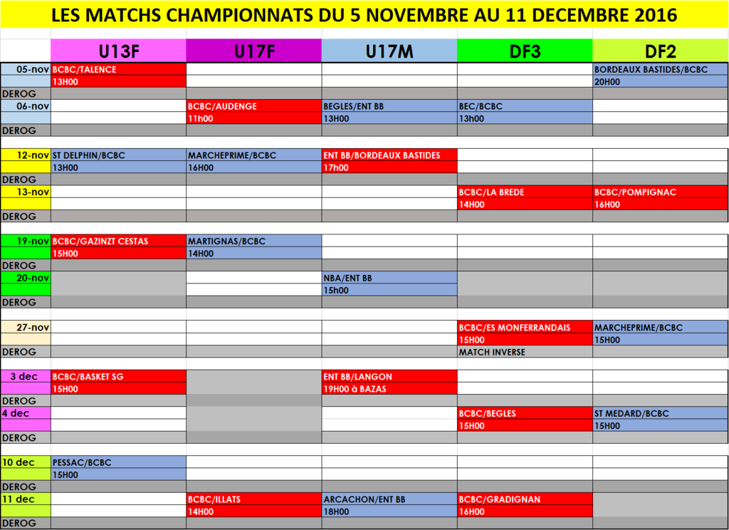 Voici le planning des matchs du championnat jeunes (U13 à U17) et séniors pour la période du :